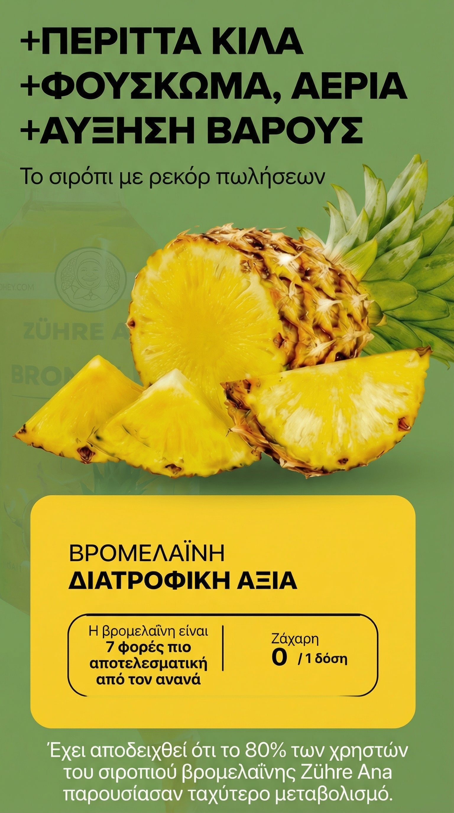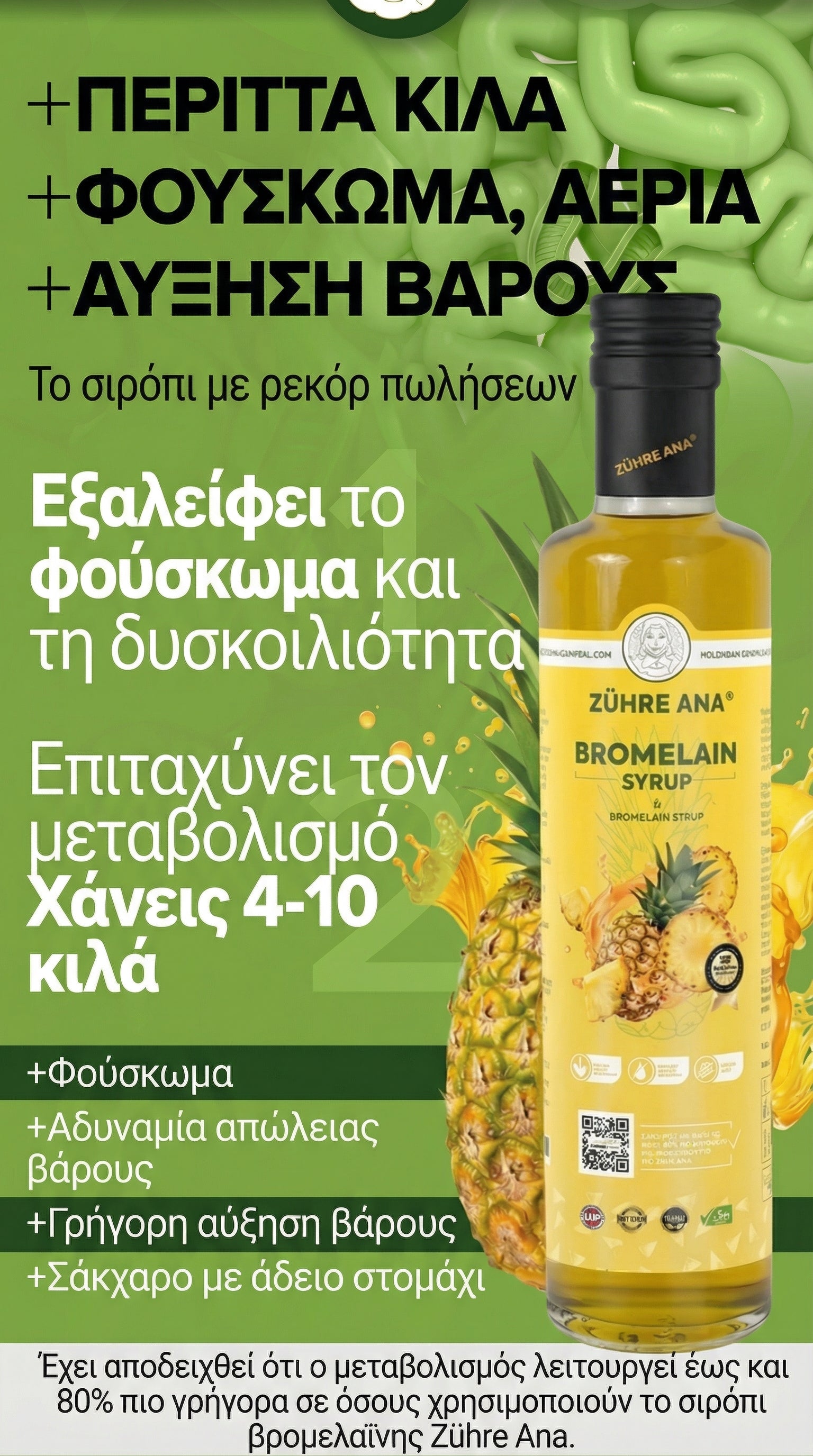 Το Σιρόπι Βρομελαΐνης είναι ένα 100% φυσικό συμπλήρωμα διατροφής, σχεδιασμένο για να υποστηρίζει τον έλεγχο του βάρους, τη σωστή λειτουργία του μεταβολισμού και τη μείωση του φουσκώματος.